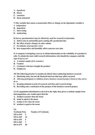 The document contains a practice exam for a business research methods course. It includes 30 multiple choice questions covering topics like research methods, statistical concepts, probability distributions, sampling, and ethics. The questions assess understanding of key business research concepts and techniques.