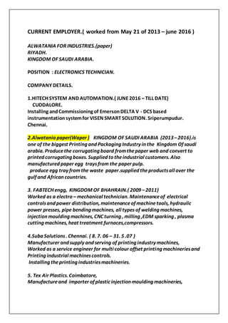 Balachandran has over 15 years of experience in electrical, instrumentation, electro-mechanical, and industrial hydraulics fields. He has expertise in power distribution, PLC logic design, electrical machine maintenance, industrial machinery installation and maintenance, hydraulic and pneumatic systems, boiler and furnace control, and more. Balachandran has experience with instrumentation and control systems erection, loop checking, calibration, troubleshooting, PLC programming, SCADA, drives, and industrial automation. He is seeking opportunities in electrical, instrumentation, control, and industrial hydraulics fields that utilize electronic controls.