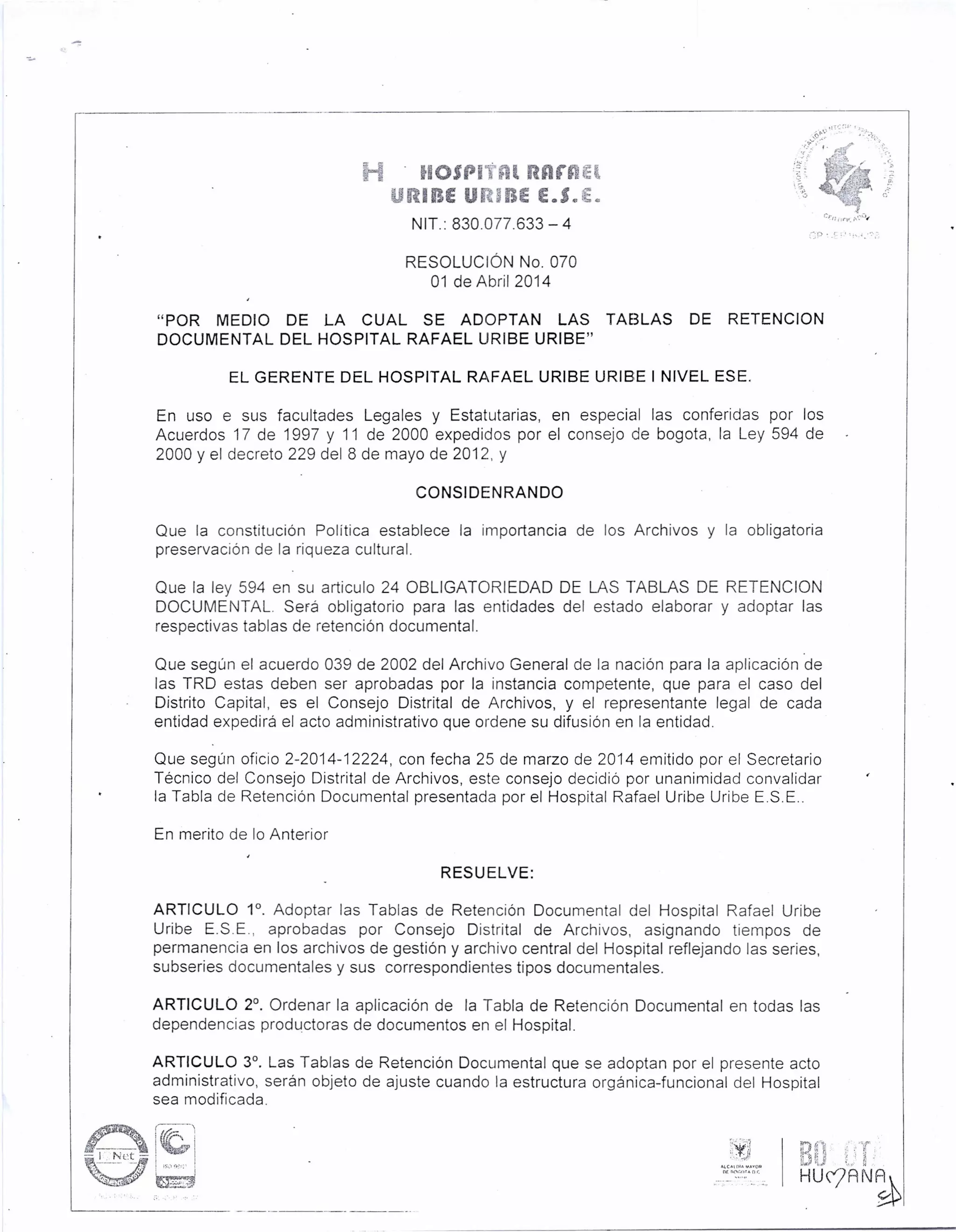 Res.070 2014 Hospital Rafael Uribe Uribe E.S.E.