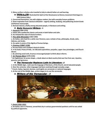 The document provides a detailed overview of the Renaissance period in Europe between the 14th and 17th centuries. It discusses the key characteristics including a revival of interest in classical antiquity and emphasis on reason and individualism over faith. The Renaissance originated in Italy and was spurred by wealthy patrons such as the Medicis in Florence. Notable artistic achievements included works by figures like Leonardo da Vinci, Michelangelo, and Shakespeare. The period also saw a rise in literature in vernacular languages and the spread of humanism.