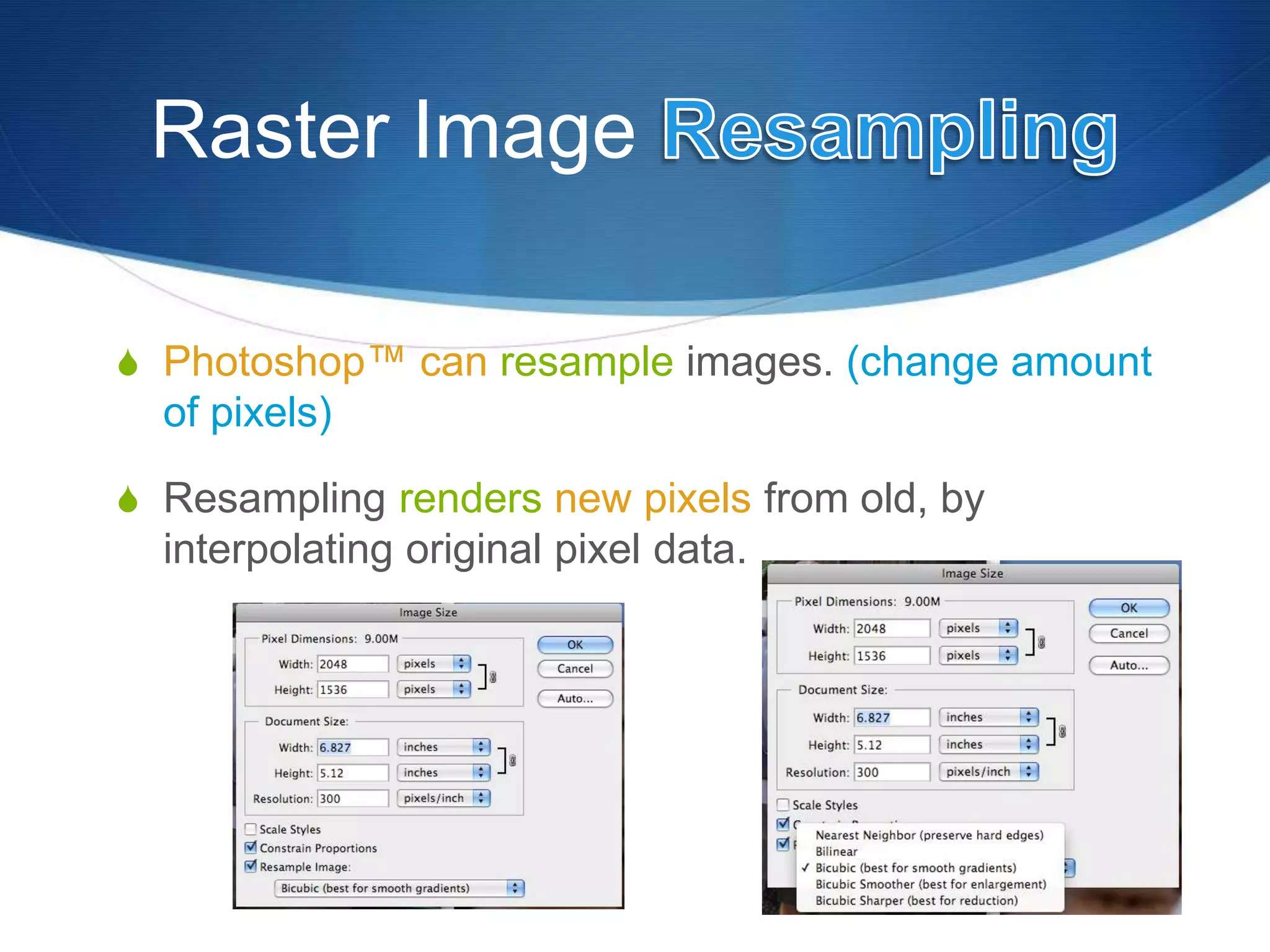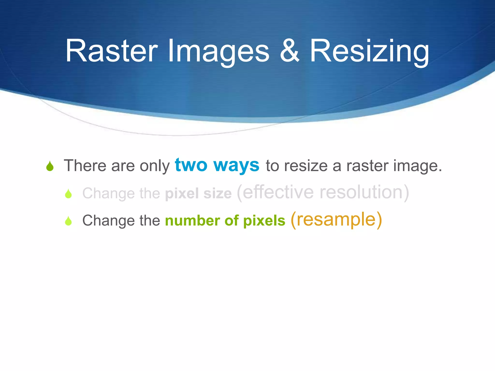 This document discusses raster images and resizing. There are two ways to resize a raster image: change the pixel size or change the number of pixels through resampling. Resampling creates new pixels by interpolating data from original pixels, so the resized image is not identical to the original. Resizing can introduce unwanted colors or effects. Bit depth determines the number of colors or shades of gray an image can display, with more bits allowing more colors or levels of gray. File compression is used to reduce large raster file sizes, and can be either lossless or lossy.