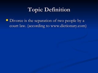 The document discusses arguments for and against divorce. Pro-divorce arguments include that divorce is acceptable if there is abuse or adultery in the marriage. Anti-divorce arguments are that divorce harms families and children, increases welfare costs, and goes against religious teachings that marriage is intended to be permanent. The thesis is that while some marriages end in divorce, the church believes divorce is morally wrong without cause.