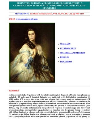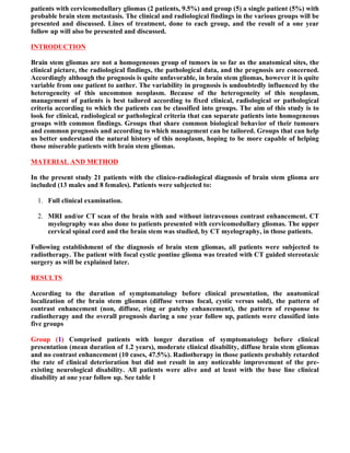 The document describes a study that classified 21 patients with brain stem gliomas into 5 groups based on clinical features and radiological findings. Group 1 had diffuse gliomas and a relatively better prognosis. Group 2 also had diffuse gliomas but a worse prognosis. Group 3 consisted of patients with focal pontine or midbrain gliomas. Group 4 contained patients with cervicomedullary gliomas. The study analyzed each group's clinical features, treatment responses, and outcomes to better understand patterns in brain stem gliomas.