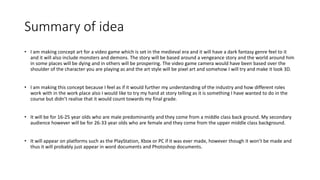 The document provides concept details for a dark fantasy video game set in the medieval era featuring monsters and demons. The protagonist's story will involve vengeance. The world will include both dying and prosperous areas. The game would use an over-the-shoulder camera and pixel art style. The concept aims to further the author's understanding of different industry roles and storytelling skills. The target audience is predominantly male, aged 16-25 from a middle-class background, with a secondary audience of female players aged 26-33 from an upper-middle-class background. The game would appear on consoles or PC, though may only be a concept without full development.