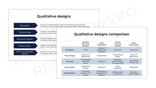 Ethnography focuses on observing cultural practices and aims to understand a culture from the members' perspectives. Phenomenology focuses on how people experience phenomena and aims to describe the essence of shared experiences. Case study research focuses on complex systems like organizations and aims to describe and interpret the case. Textual analysis involves interpreting verbal and nonverbal signs like films or books and aims for the researcher's interpretation. Action research focuses on using findings to solve problems through collaboration and aims to evaluate solutions and recommend improvements.