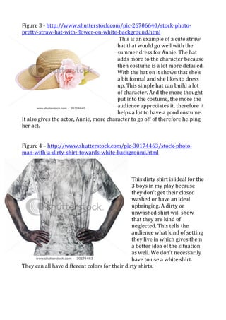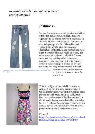 The document discusses costume and prop ideas for a play. It proposes ripped jeans and dirty shirts for the boys' costumes to portray neglected characters. For the character Annie, it suggests a floral summer dress, straw hat, and tap shoes. The costumes are intended to establish the characters and setting while remaining practical for the actors.