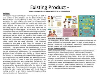 1. "So You Think You've Got It Bad? A Kid's Life in Ancient Egypt" published by Nosy Crow, which uses colorful illustrations and text to educate children about life in Ancient Egypt. It aims to show children that modern life is better while teaching them about the past.