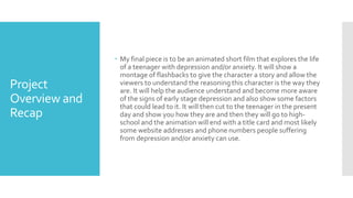 The document provides an overview of the student's final animation project exploring depression and anxiety in teenagers. It will use flashbacks to develop the character and show possible factors leading to their mental state. The animation will end with resources for viewers suffering from similar issues. The student discusses several reference works and how they effectively use storytelling, aesthetics, humor and serious themes. Lessons on character development, visual storytelling using color and maintaining a realistic yet accessible tone will influence the student's own short film.