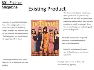 The magazine covers and articles analyzed all feature fashion from different decades, with the 1990s and 1960s styles deemed most popular currently. Central model placement, bold titles, and plain backgrounds
