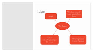 This document provides background information on Tim Burton's career and filmmaking style to inform a documentary. It includes a timeline of Burton's films, notes on his frequent collaborators, conventions of documentaries, analysis of example documentaries, and research on what appeals to Burton fans. Key points are Burton's gothic and outsider-focused characters, influence of German Expressionism, and animated films being more beloved than live action. The document aims to understand the audience and incorporate elements that reflect Burton's distinctive visuals and appeal to fans.