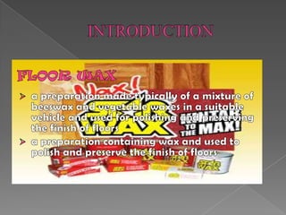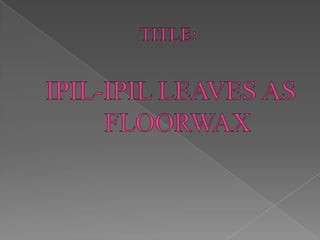 The document describes the white leadtree (Leucaena leucocephala), a tree native to Mexico and Central America. It has several common names and is used for firewood, fiber, and livestock fodder. The document also provides a procedure for making an ipil-ipil floor wax from the tree's leaves as an alternative to commercial floor waxes. Key ingredients in the wax include ipil-ipil leaf juice, paraffin wax, and mineral oil. The procedure involves extracting wax from the leaves and combining it with the other ingredients by melting and stirring them.