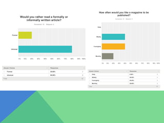 The document discusses research conducted to inform the creation of a new music magazine. Audience research using a questionnaire found that the target audience is mostly male, aged 17-18, from a middle-class background, willing to spend £1.50-3 on the magazine, and currently in college or university. Research of existing music magazines Kerrang! and Big Cheese informed choices around style, content, and pricing. Based on this research, the new magazine will target males aged 15-34, cost £2.50, include features like interviews and articles by artists, and be published fortnightly.