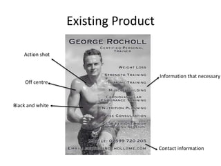 The document summarizes research conducted to develop a promotional video and materials for a gym. Product research identified common features like social media, lists of services, interesting layouts, and action shots. Questionnaires provided insights into the target audience which is primarily males aged 17 who enjoy fitness. Interviews recommended including upbeat background music, short 5-10 second clips edited together rapidly, and a minimalist poster design with key information. The research gathered feedback on content, video style, and design preferences to effectively appeal to the audience.
