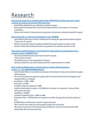 1) Several celebrities expressed regret over plastic surgery procedures they had in the past, with Amy Childs saying her lip fillers and breast augmentation ruined her confidence.