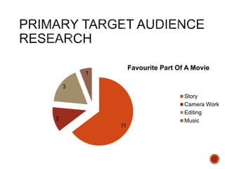 My primary audience research showed that the target audience for my horror short film idea is people aged 16-20, with roughly equal numbers of males and females. My secondary research validated this, showing that audiences for similar films also fell within this age range. I plan to rate the film 15 to allow creative freedom while avoiding issues with younger viewers. In experiments with camera techniques, I found that low and level shots worked but did not achieve my goals. Editing experiments showed minimizing transitions preserves suspense. Audio experiments taught me Foley techniques that could enhance sound effects in my film. Potential challenges include scheduling around college times and availability of personnel.