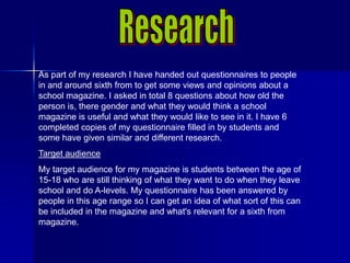 The document discusses research conducted to gather opinions on a proposed school magazine. The author handed out questionnaires to students ages 15-18 asking about demographics, magazine reading habits, pricing and frequency preferences for a school magazine. Most respondents were willing to pay £1-£1.99 for a monthly magazine, with content relevant to sixth form students to inform them about school events and options after leaving school.