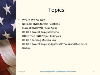 This document outlines the research and development program for fiscal year 2012 at the Center for Emerging Solutions and HR Innovations. It provides details on the current state of ongoing R&D projects, criteria for new project requests, funding mechanisms, and the approval process and timeline. The R&D program management office oversees 24 ongoing projects with a total estimated cost of $X.X million and evaluates project performance on a monthly and quarterly basis through a research and development approval committee.