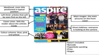 The document summarizes key design elements of a school magazine, including a smiling girl on the front cover to portray the school as happy. The left third of the front page features articles targeted at sixth formers about students, TV, and creativity. Page numbers are included to indicate where full articles can be found. Images are used throughout the contents page to showcase more of what is inside and make the page appear more full.