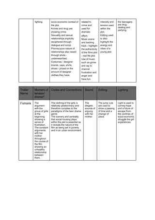 The document summarizes key details from trailers of four films: Thirteen, Juno, Kidulthood, and Fishtank. It outlines the main moments of tension or drama in each film and analyzes the codes and conventions used in terms of costumes, settings, sounds, editing techniques, and lighting. The films explore themes of teenage rebellion, crime, relationships and family struggles through genres like drama and indie.