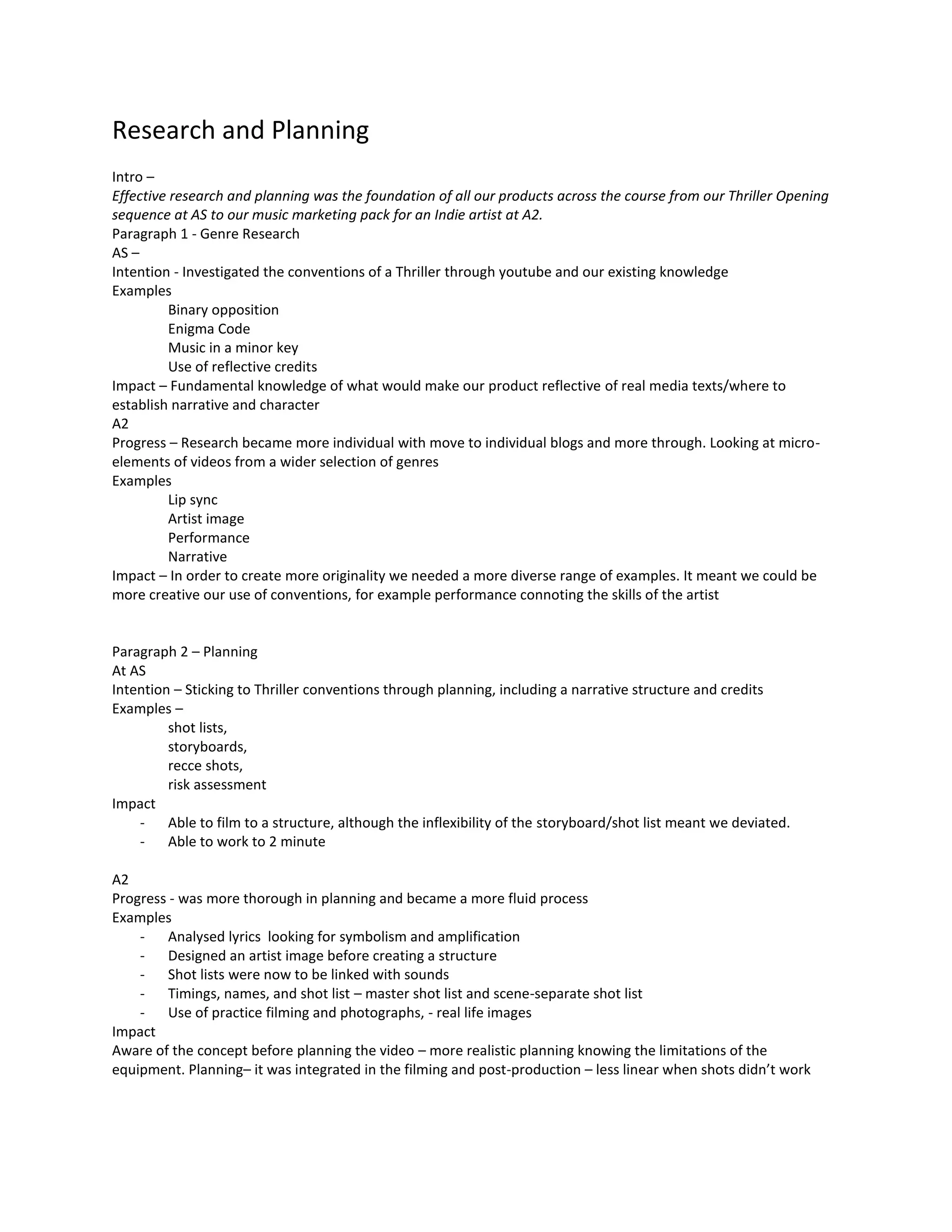 The document discusses research and planning for two different media projects. For the first project (AS), research focused on thriller conventions to inform a 2-minute thriller sequence. Planning included shot lists and storyboards. For the second project (A2), research was more individualized and looked at specific artist elements. Planning was more thorough, analyzing lyrics and designing an artist image before structuring the video. The improved planning process allowed for a more fluid and integrated approach between planning, filming, and post-production.