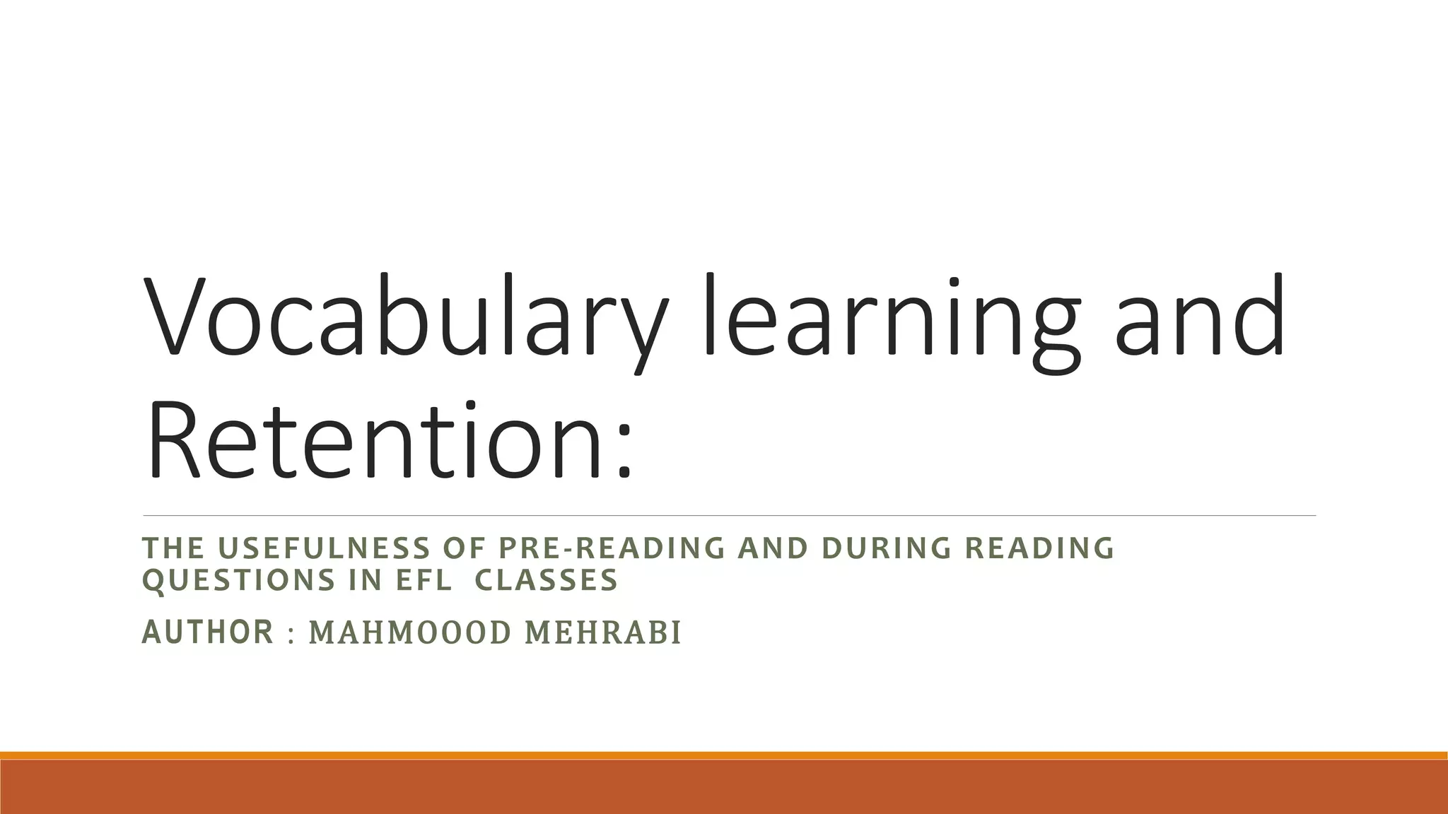 This study examined the impact of pre-reading and during-reading questions on vocabulary learning and retention in EFL classes. 88 intermediate English students were divided into two groups - one received texts with pre-reading questions and the other with inserted questions. Both groups read passages and completed vocabulary tests after each session for 5 sessions. After 2 weeks, a final vocabulary test was administered to measure retention. Results showed that the group with inserted questions performed better on vocabulary tests after each session and on the final retention test, rejecting the hypotheses that question type would not impact learning or retention. The findings suggest that during-reading questions lead to greater vocabulary gains and retention than pre-reading questions.