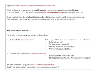 The document discusses various cognitive biases and errors that can impact entrepreneur's thinking, such as counterfactual thinking which leads entrepreneurs to experience more regret over missed opportunities. It also examines how affect infusion causes entrepreneur's moods and feelings to more strongly influence their judgments and decisions given they engage in more careful thought than others. Finally, it analyzes attributional style and the self-serving bias that causes entrepreneurs to attribute successes more to internal factors and failures more to external factors.