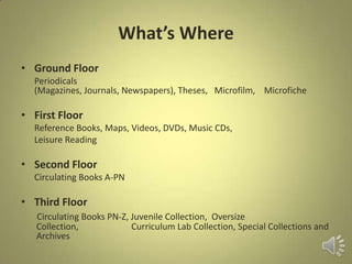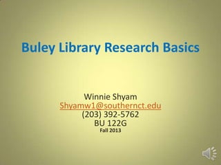 This document provides an overview of resources and services available at Buley Library. It describes the layout of the library including locations for periodicals, books, videos, and special collections. It outlines how to search the online catalog to find books, DVDs, and other materials. The document explains how books are arranged on the shelves using the Library of Congress classification system. It also provides guidance on performing different types of searches and using search operators to focus results. Additionally, it reviews how to find and evaluate journal, magazine, and newspaper articles using library databases. The document concludes by highlighting research guides and ways to get assistance from the reference desk or a subject librarian.
