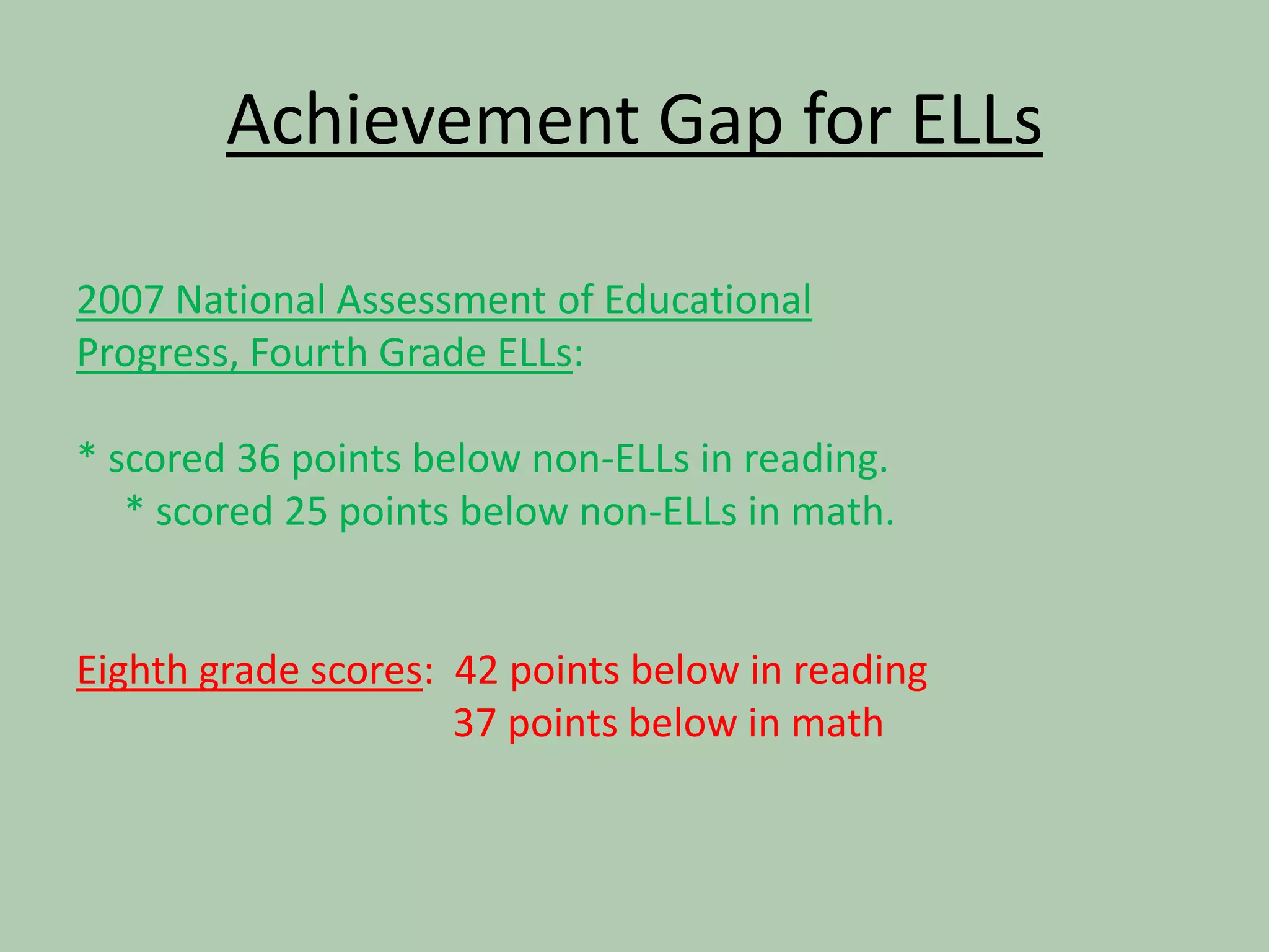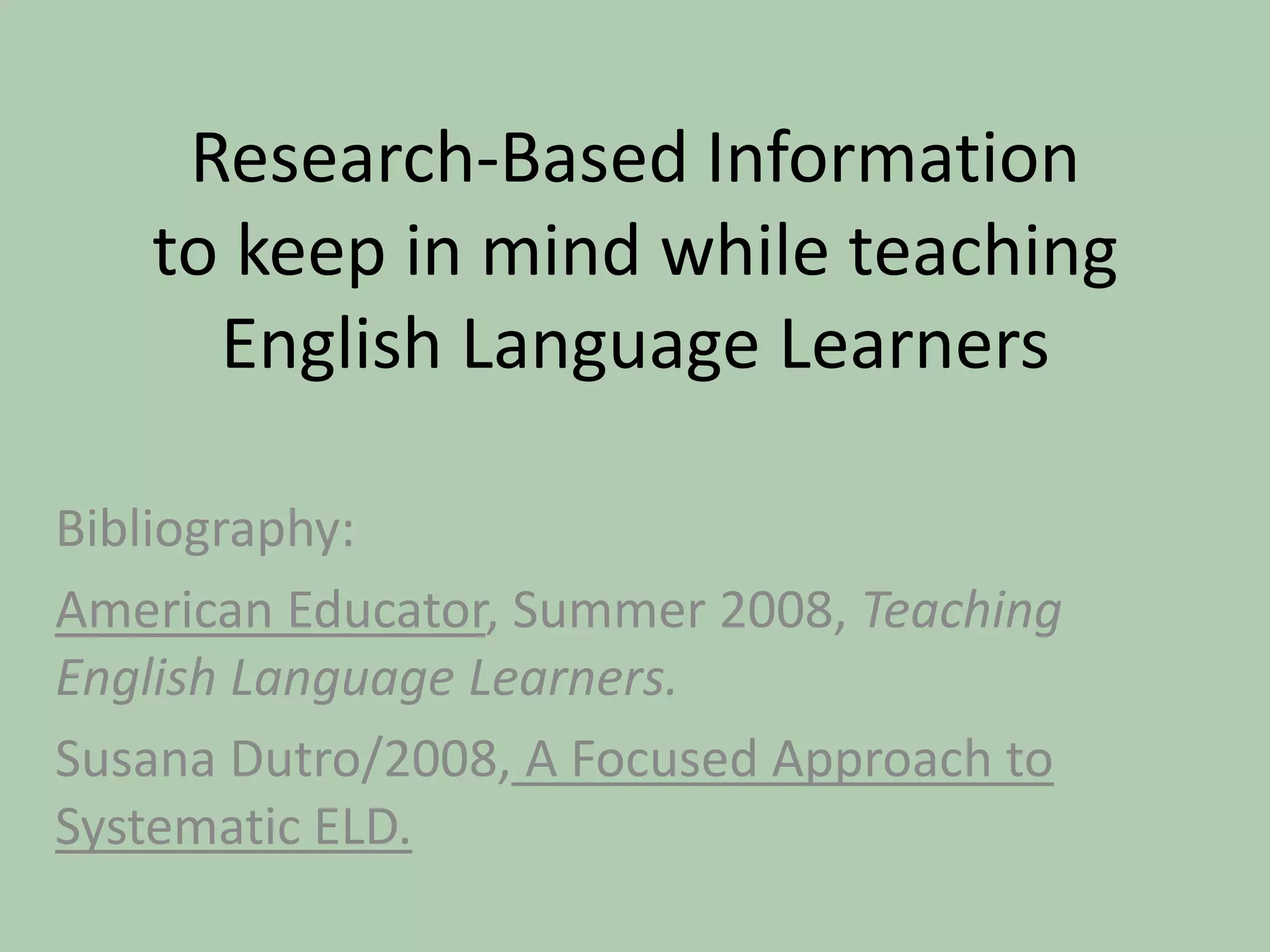 This document provides information on teaching English Language Learners and summarizes some key research findings. It notes that ELL students score significantly below non-ELL peers on standardized tests and that the population of ELL students is growing. Research shows that teaching students to read in their native language promotes higher levels of English reading ability. The document also outlines English proficiency levels from beginning to advanced and describes effective instructional practices at each level, such as providing basic vocabulary supported by visuals for beginning levels and exposing advanced levels to more complex texts.