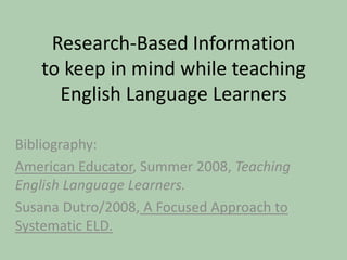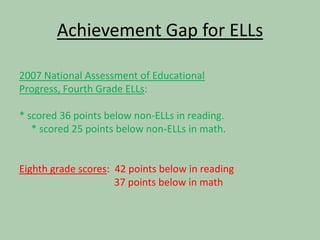 This document provides information on teaching English Language Learners and summarizes some key research findings. It notes that ELL students score significantly below non-ELL peers on standardized tests and that the population of ELL students is growing. Research shows that teaching students to read in their native language promotes higher levels of English reading ability. The document also outlines English proficiency levels from beginning to advanced and describes effective instructional practices at each level, such as providing basic vocabulary supported by visuals for beginning levels and exposing advanced levels to more complex texts.