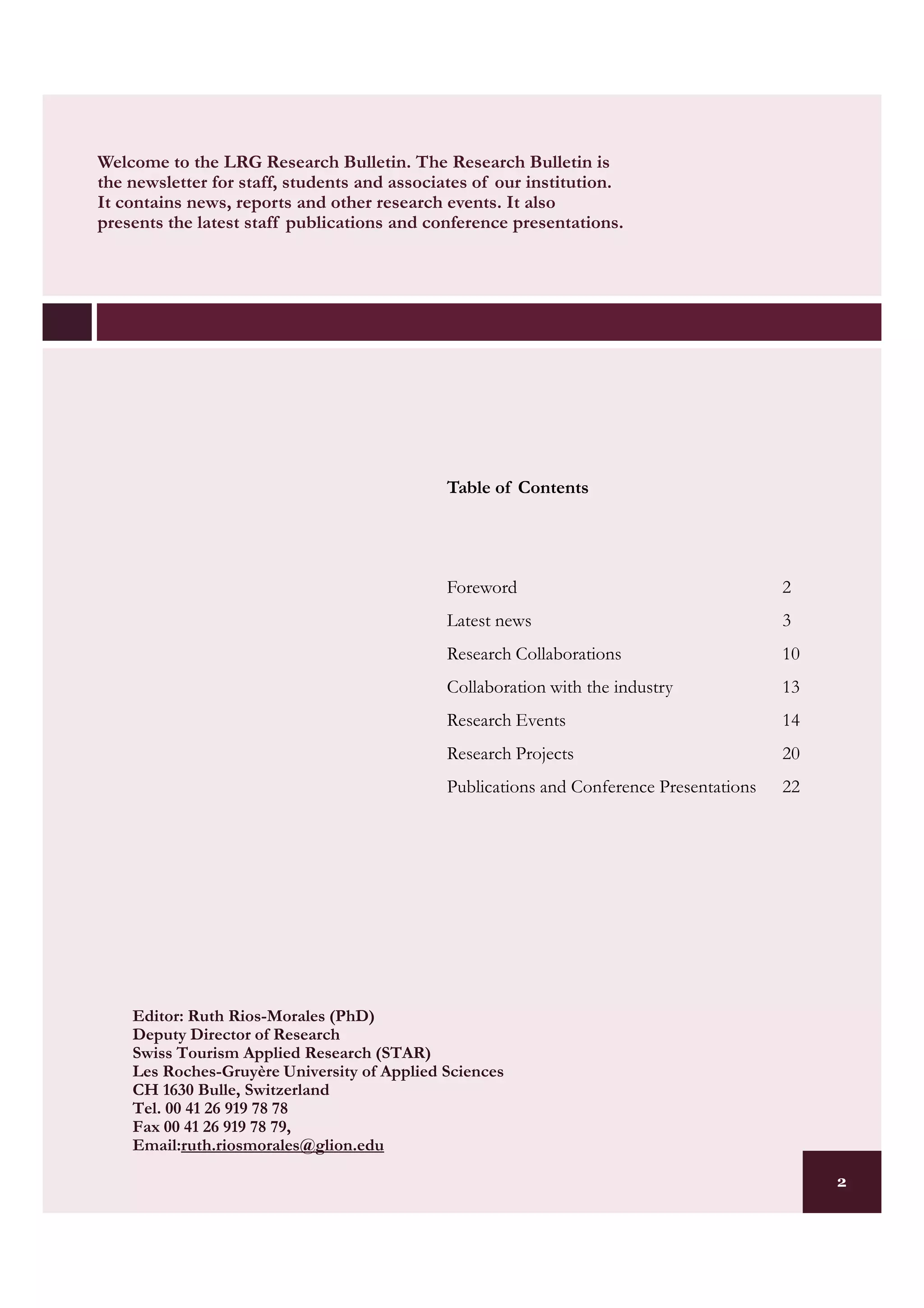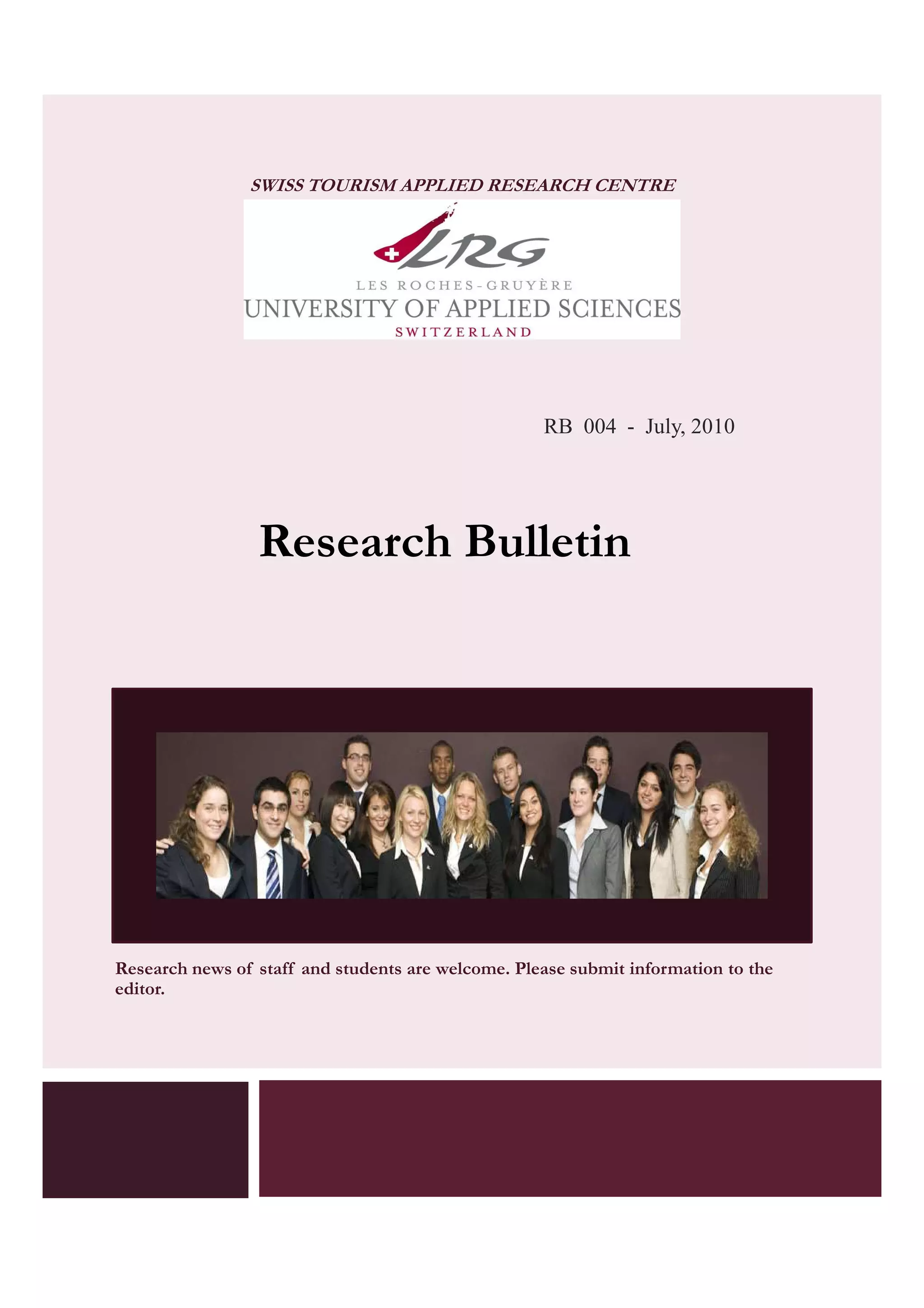 The document summarizes research news from the Swiss Tourism Applied Research Centre. It discusses recent publications and presentations by staff, including two staff members who obtained their doctorates. It also summarizes collaborative projects between the research centre and organizations like the Fribourg Tourism Bureau and events like a conference hosted by the research centre on research methodologies.
