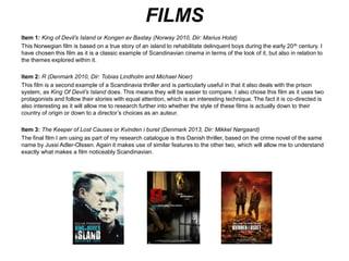 This research catalogue contains 15 items to aid research on Scandinavian thriller films. The items include 5 films from Norway, Denmark, and Sweden to compare techniques and themes. Two books provide overviews of Scandinavian and Nordic cinema as well as the thriller genre. Additional sources include articles on Scandinavian cinema aesthetics, an interview with influential Danish director Lars Von Trier, websites on Scandinavian and Danish film, and YouTube videos of filmmaker interviews and a documentary on European cinema history. The sources aim to understand what makes films distinctly Scandinavian through analyzing techniques, themes, and the development of the region's cinema traditions.