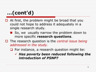 The document provides guidance on formulating a research problem and developing an effective research proposal. It discusses identifying a research topic by drawing from professional experience, literature reviews, and social/technological changes. A research problem refers to a difficulty a researcher wants to solve in a theoretical or practical context. Defining the problem clearly involves narrowing its scope and expressing it in specific, measurable terms. Key parts of a research proposal include the title, abstract, background, problem statement, research questions, objectives, hypothesis, methodology, and work plan. The proposal establishes the justification, approach, and intended outcomes of the proposed study.