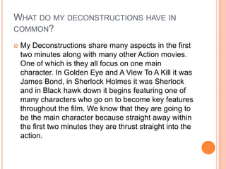 The document discusses the opening two minutes of four action movies - Golden Eye, A View To A Kill, Sherlock Holmes, and Black Hawk Down. It finds that they all focus on establishing a main character and thrusting them into action or conflict quickly. They also use similar techniques like non-diegetic music to set tension, extreme close-ups, and setting the scene visually or through titles. The document analyzes how these movies use similar techniques in their mise-en-scene, sound, camerawork and editing to grab the viewer's attention in the opening moments.