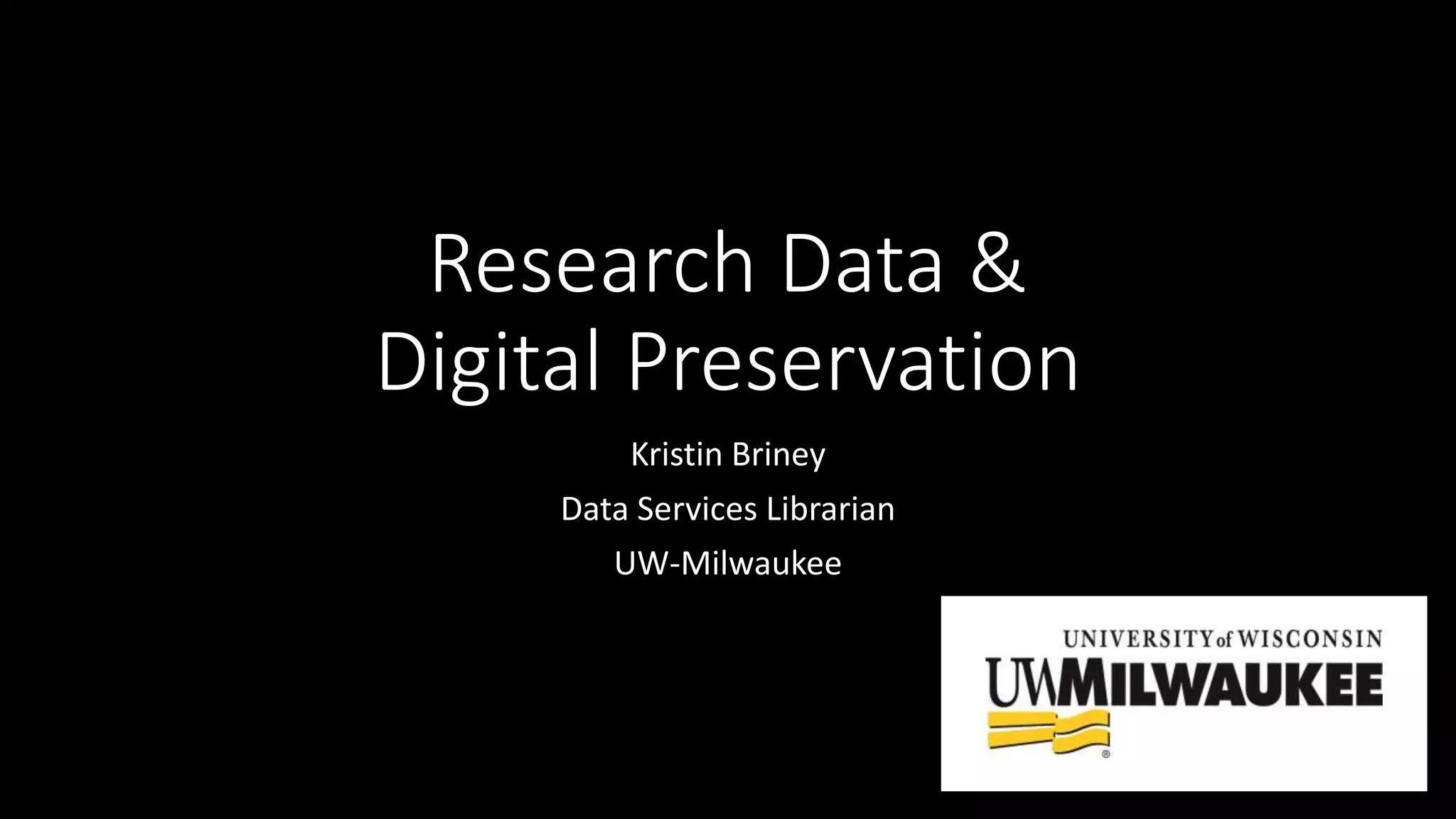 The document discusses the complexities of digital preservation and data curation, highlighting the importance of effective data management in maintaining usable research data over time. It emphasizes the need for proper formatting, adequate resources, and early engagement in the data curation process. The presentation is shared under a Creative Commons license, with links to relevant sources and images provided.