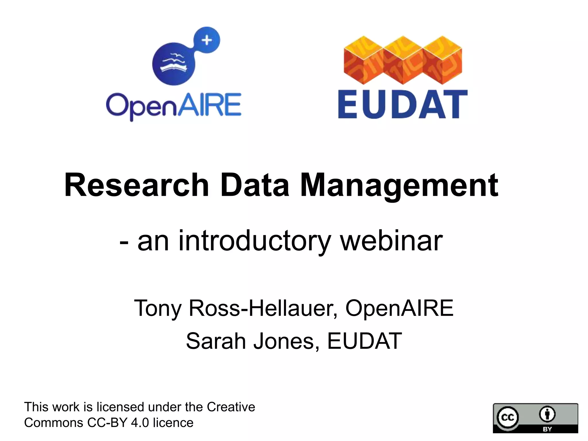 The webinar discusses the importance of research data management (RDM) for enhancing data organization, usability, and sharing, while addressing challenges associated with data loss and reproducibility issues. It outlines the requirements of RDM within the Horizon 2020 framework, emphasizing the creation of data management plans and the role of services from EUDAT and OpenAIRE. Key components of effective data management include data accessibility, preservation, and appropriate licensing for sharing research data.