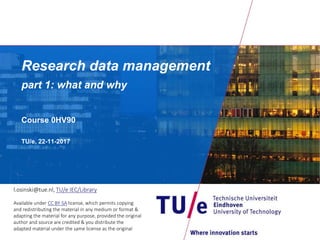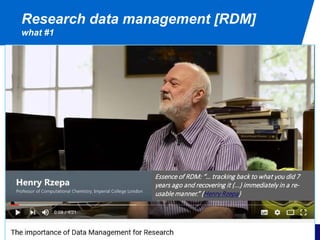 The document discusses the importance of Research Data Management (RDM), emphasizing its role in protecting data integrity, facilitating sharing for reuse and reproducibility, and promoting scientific integrity. It outlines best practices for managing data, including organization, file naming, and documentation, as well as the rationale for sharing data during and after research. Additionally, it covers data storage solutions and platforms for effective data sharing within the research community.