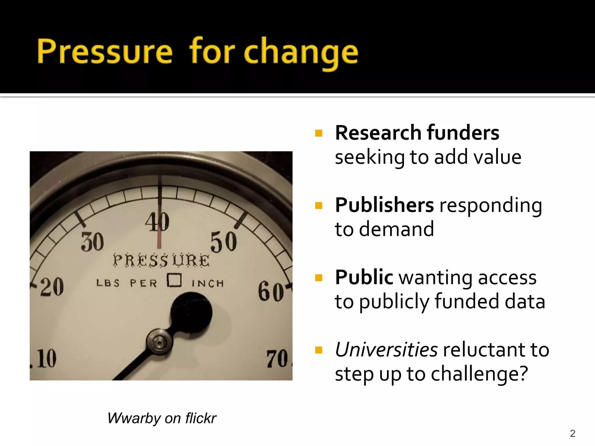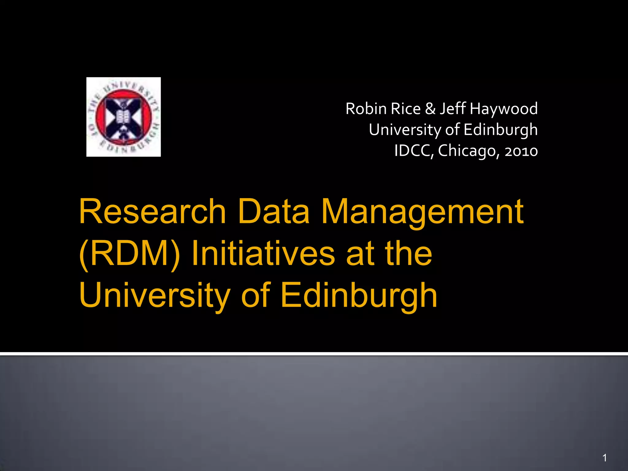 The document outlines initiatives for research data management (RDM) at the University of Edinburgh, detailing pressures for change from funders, publishers, and the public. It describes the development of data library services, projects, and policies aimed at enhancing data accessibility, management, and storage requirements amidst growing compliance demands. Recommendations include creating standard procedures for data handling and establishing a data audit framework across universities.