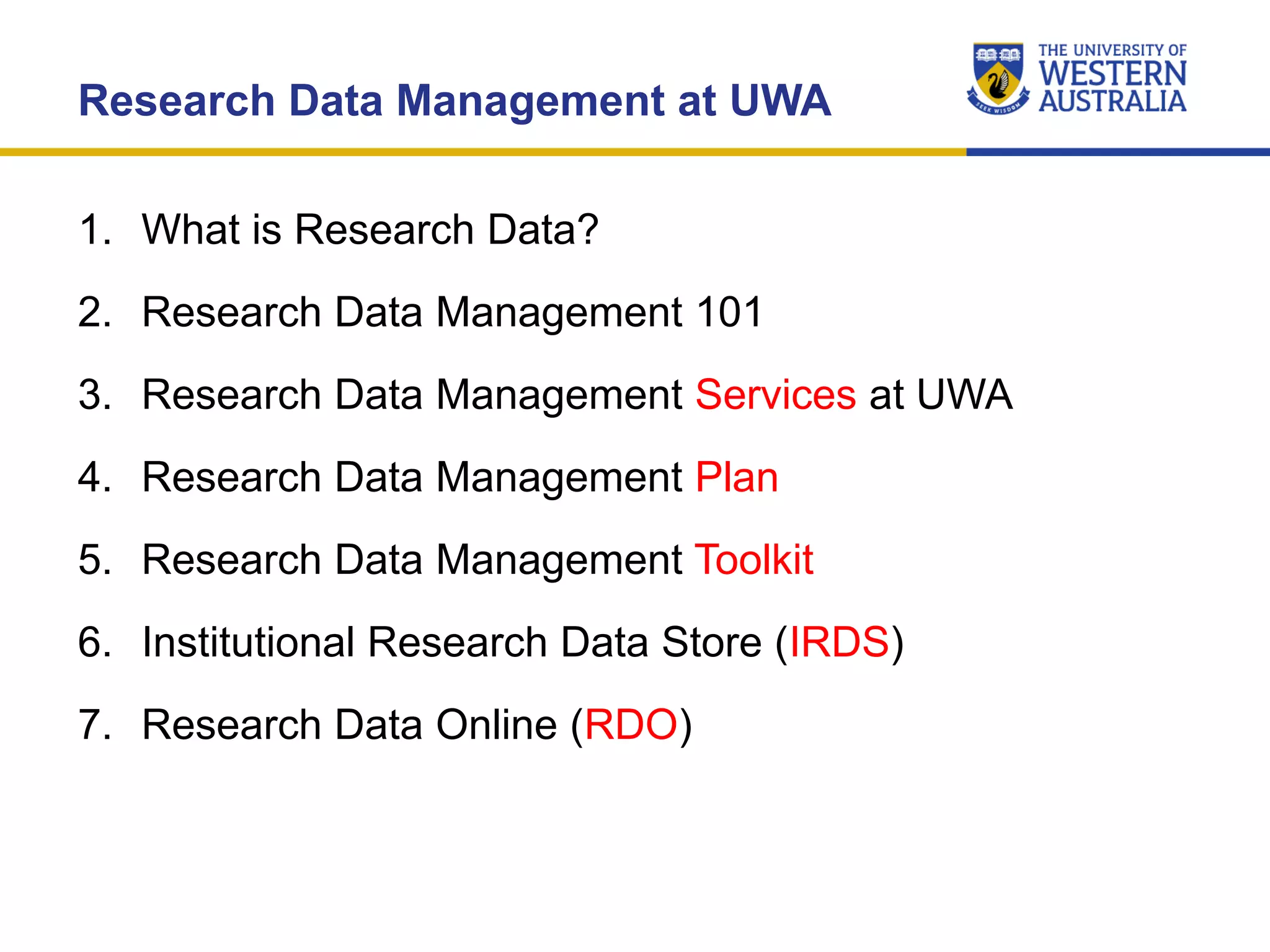 The document outlines the importance of research data management at the University of Western Australia (UWA), detailing its services, guidelines, and tools for managing research data effectively. Key topics include compliance, data sharing benefits, and retention policies, emphasizing the role of various stakeholders like governments and funders in promoting responsible research data practices. Additionally, it discusses the resources available at UWA, such as the Institutional Research Data Store (IRDS) and online data management tools, to support researchers in managing their data securely and efficiently.
