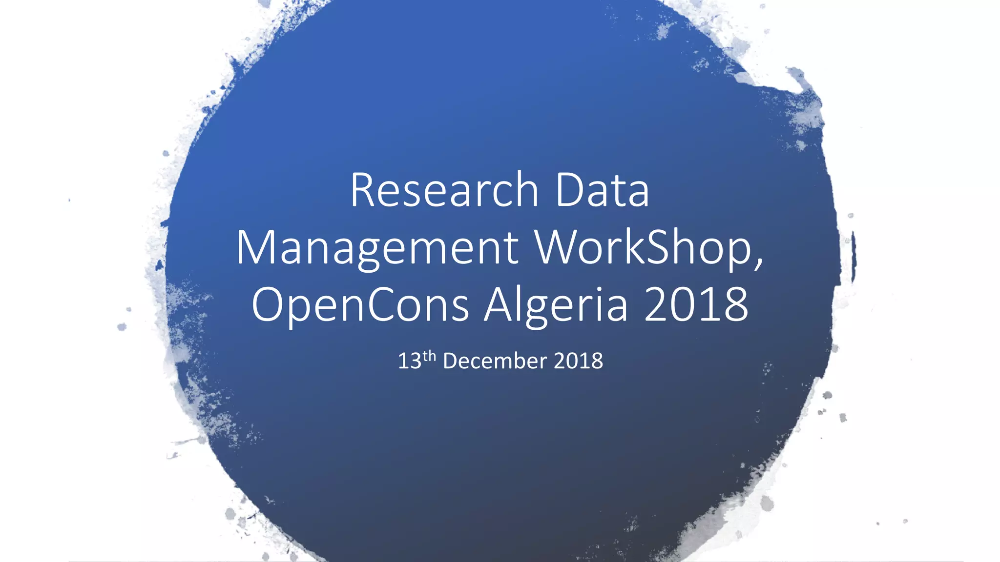 The document outlines a workshop on Research Data Management (RDM) held in Algeria on December 13, 2018, which focuses on the importance of RDM in ensuring accessibility, usability, and accountability of research data throughout its lifecycle. Participants are expected to engage in group sessions to explore various aspects of RDM, including management plans, policies, services, principles, and tools, all aimed at promoting open access in research. The workshop includes structured activities and presentations to foster understanding and application of RDM concepts.