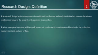 The document outlines the definition and importance of research design, describing it as the arrangement of conditions for data collection and analysis. It categorizes research design into sampling, observational, statistical, and operational designs and distinguishes three main types: exploratory, descriptive, and causal research. Additionally, it highlights essential features of good research designs and key concepts such as variables and hypothesis-testing.