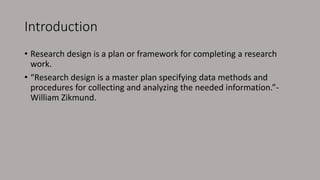 The document discusses different types of research design used in conducting research studies. It describes exploratory, descriptive, comparative, and interventional research designs. Exploratory research aims to gain insights, descriptive research describes variables as they exist using methods like surveys and case studies, comparative research examines relationships and differences between variables, and interventional research tests hypotheses by manipulating variables and comparing experimental and control groups. The key elements of research design discussed are problem identification, data collection and analysis methods, population and sampling, and reporting findings.