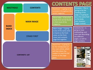 The document provides details on the layout and design of a magazine masthead, cover page, and interior article page. The masthead will have a "smashed effect" and include promotional competitions. The cover's main image will take up most of the page and overlap with the main storyline. Interior pages will include pull quotes from interviews, a main article in a question and answer format, and a colored standfirst paragraph to introduce the full article.