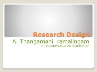 The document discusses research design, which refers to the structure and planning of a research study rather than logistical details. Key components of a research design include determining the study topic, objectives, location, data requirements, sample design, data collection techniques, analysis approach, and report style. Good research design considers available resources like staff, time, and money while allowing flexibility. The design should minimize bias and maximize reliable data collection.