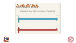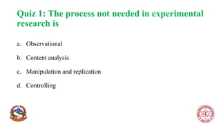 This document provides an overview of research methods and designs. It discusses qualitative and quantitative research methods, with qualitative focusing on lived experiences and meanings and quantitative focusing on numerical data. It also discusses different types of study designs, including observational studies like cross-sectional and longitudinal, and experimental designs like clinical and community trials. Experimental research allows investigators to actively alter variables to evaluate relationships, while considering factors like the purpose of the study, strength of evidence desired, time and resources available, and ethics.