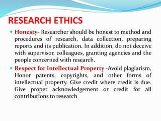 The document outlines key principles of research ethics that a researcher should follow, including honesty, respect for intellectual property, confidentiality, keeping promises and commitments, and being careful. It notes that a researcher should protect confidential information, avoid plagiarism, and give proper credit to others' work. The document also lists qualities needed for research, such as knowledge of methodology, intelligence, communication skills, and being systematic. Qualities of an ideal supervisor are described as well, including expertise in their field, support, availability, and interest in students' careers.