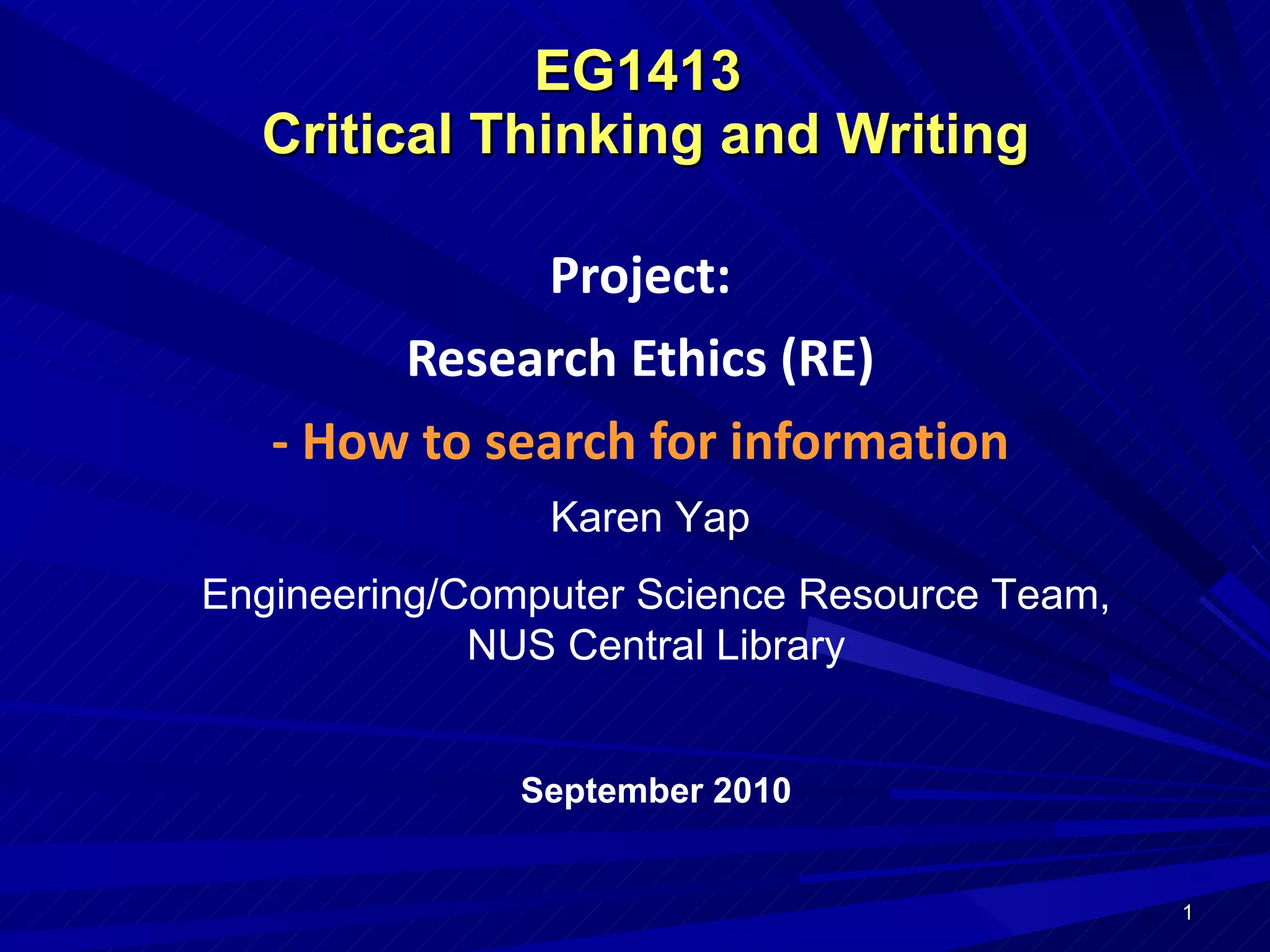 The document provides information on researching ethics issues in Singapore. It discusses what research ethics involves, gives examples of ethics issues, and outlines sources for finding information on ethics in Singapore such as books, newspapers databases, and journal databases. It also provides guidance on constructing effective search statements for research topics and finding relevant newspaper and journal articles. Potential ethics topics discussed include stem cell research and therapeutic cloning.