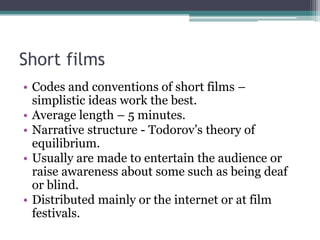 Short films are typically 5 minutes long and use simplistic narrative structures and conventions to entertain audiences. Dramas aim for realism through techniques like close-ups and editing, often following McKee's 5-step theory. Dance films focus on a main character and their training or auditions, with music synchronized to movement. When creating films, establishing the target audience, distribution method, and certification rating are important planning elements to consider, as is drawing from narrative theories like Todorov and McKee. Both posters and reviews for films should include key information while reflecting and promoting the film.