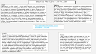 The document analyzes the trailer for the 2004 horror film "Saw". It summarizes the key techniques used in the trailer to convey the narrative and genre. These include using dark lighting and isolated locations to set an atmospheric and suspenseful tone. Dialogue and sound effects are relied on over music to draw the audience in. Jump scares and a building musical score increase tension. While brief, the trailer leaves viewers questioning and wanting to learn more, achieving its goal of enticing people to watch the full film.