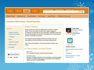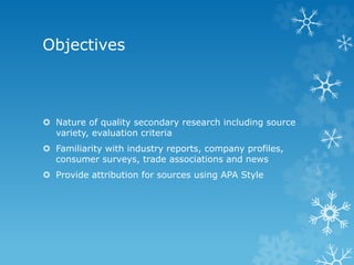 This document provides guidance on conducting secondary research and properly citing sources using APA style. It discusses evaluating a variety of industry and company sources, creating reference lists and in-text citations, and getting started with competitive research on companies like Vanguard, Johnson & Johnson, and Reckitt Benckiser. Tips are provided for source variety, quality, currency, reliability, and authority when evaluating research materials. Assistance options like scheduling meetings with a business librarian are also outlined.