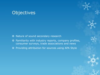 This document provides guidance on conducting secondary research for competitive effectiveness. It discusses the importance of using a variety of high-quality source materials, including industry reports, company profiles, consumer surveys, and news sources. Good research demonstrates source variety, source quality, and proper attribution using APA style citations and references. The document offers tips for starting research, including looking at industry reports, trade associations, competitor analysis using company profiles and websites, and customer analysis using market research and demographic data. It also provides examples of citing industry surveys, news articles, and instructional materials in APA style. Students are encouraged to schedule research consultations or email the librarian for additional help.